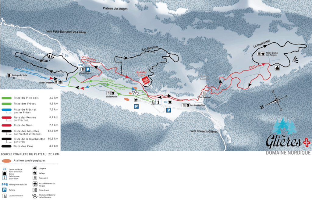 Le plan des pistes de ski de fond et piétons des Glières vous indiquent les différents parcours :